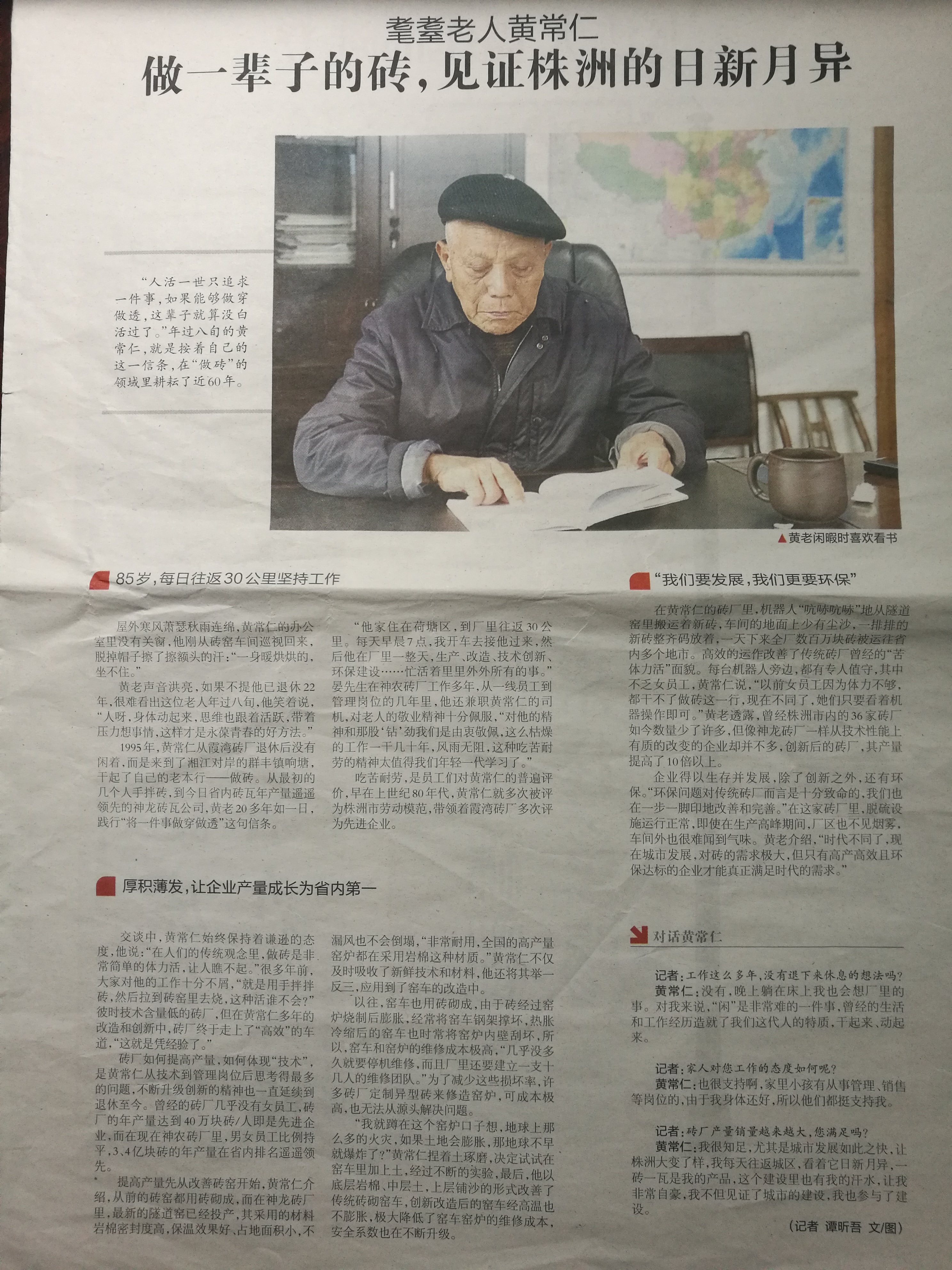 2017年11月5日株洲晚報 報道神龍磚廠耄耋老人黃常仁做一輩子的磚,見證株洲的日新月異