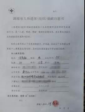 何老與紅十字會簽訂的遺體捐贈書